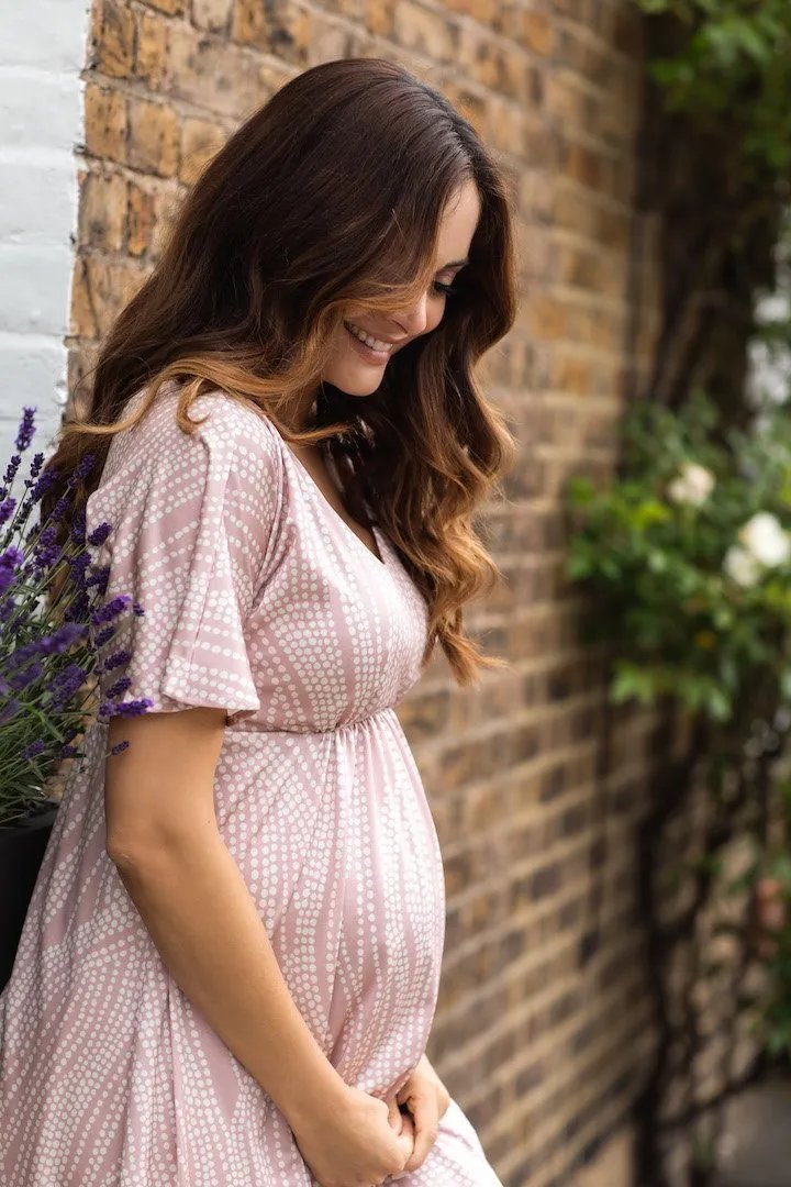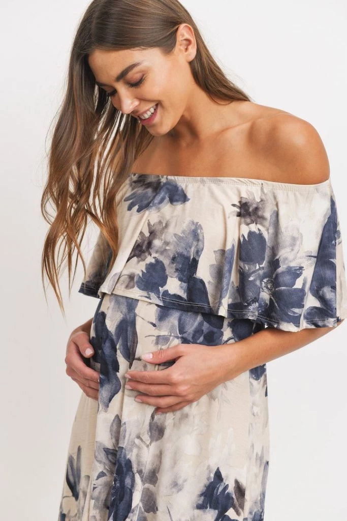 Taupe Floral Maternity Maxi Dress Ruffle Off Shoulder