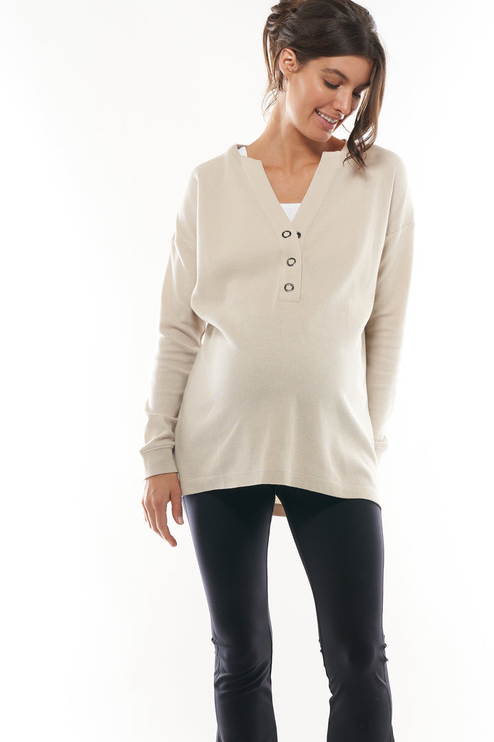 Crafted of a live-in-it-soft stretch waffle, this flattering long sleeve top has new details like a curved hem and boxy-fit for extra comfort with silver snaps for nursing.