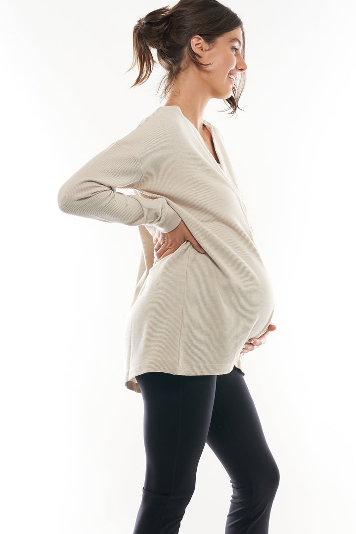 Made in a mid-weight waffle cotton jersey for a little added texture and elastane for extra comfort for a growing bump. It breathes and is an easy extra-layer for when its breezy.
