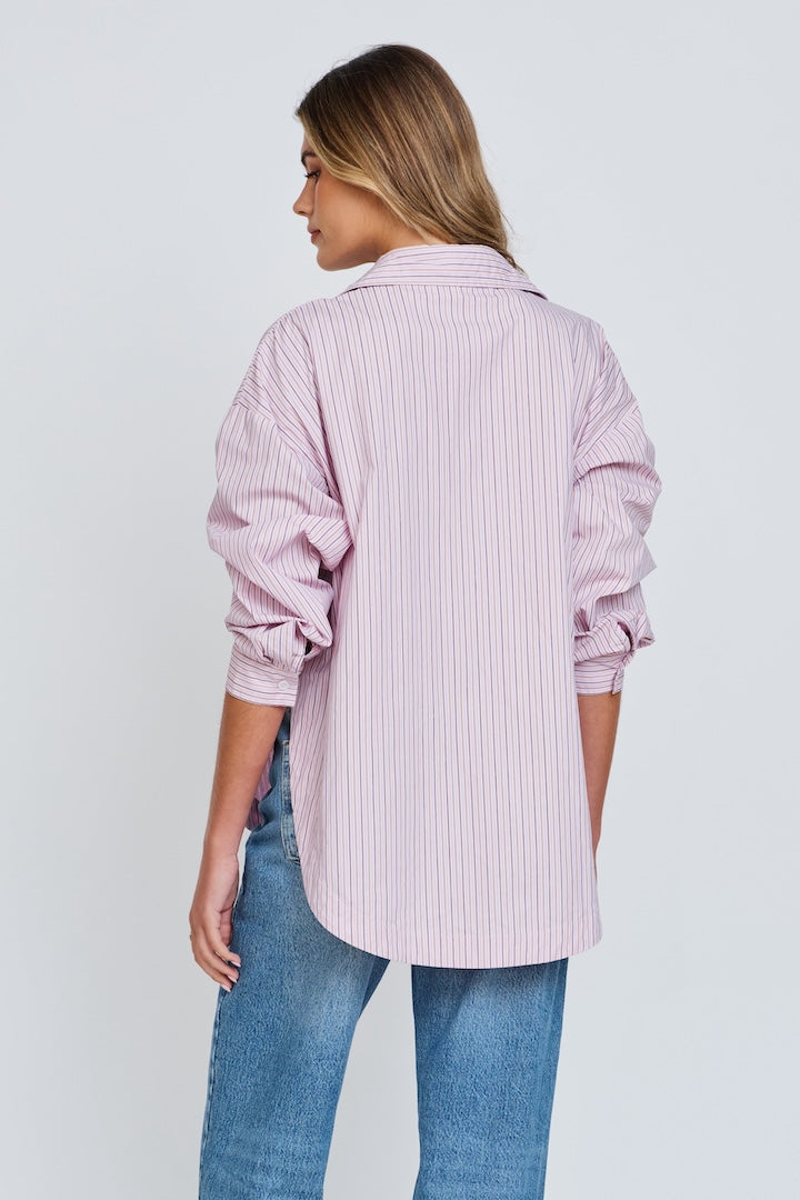 Made from durable cotton with a tonal pink stripe, it boasts a flattering curved hem, pointed collar, button-down front, and adjustable cuffs for timeless appeal. A functional patch pocket adds practicality, while its versatile design pairs effortlessly with jeans, or tailored pants for a polished look.