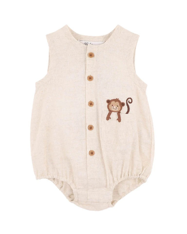 Bring playful charm to your baby's wardrobe with this breezy cotton-linen blend bodysuit, perfect for sunny days and sweet adventures. Featuring a cheeky embroidered monkey peeking out of a tiny front pocket, this sleeveless style is crafted from a breathable natural blend that keeps little ones cool and comfy. Mock wooden button detailing down the front adds a classic touch, while the soft gathered leg openings allow for easy movement and all-day comfort. An adorable go-to for warm weather and photo-ready moments.