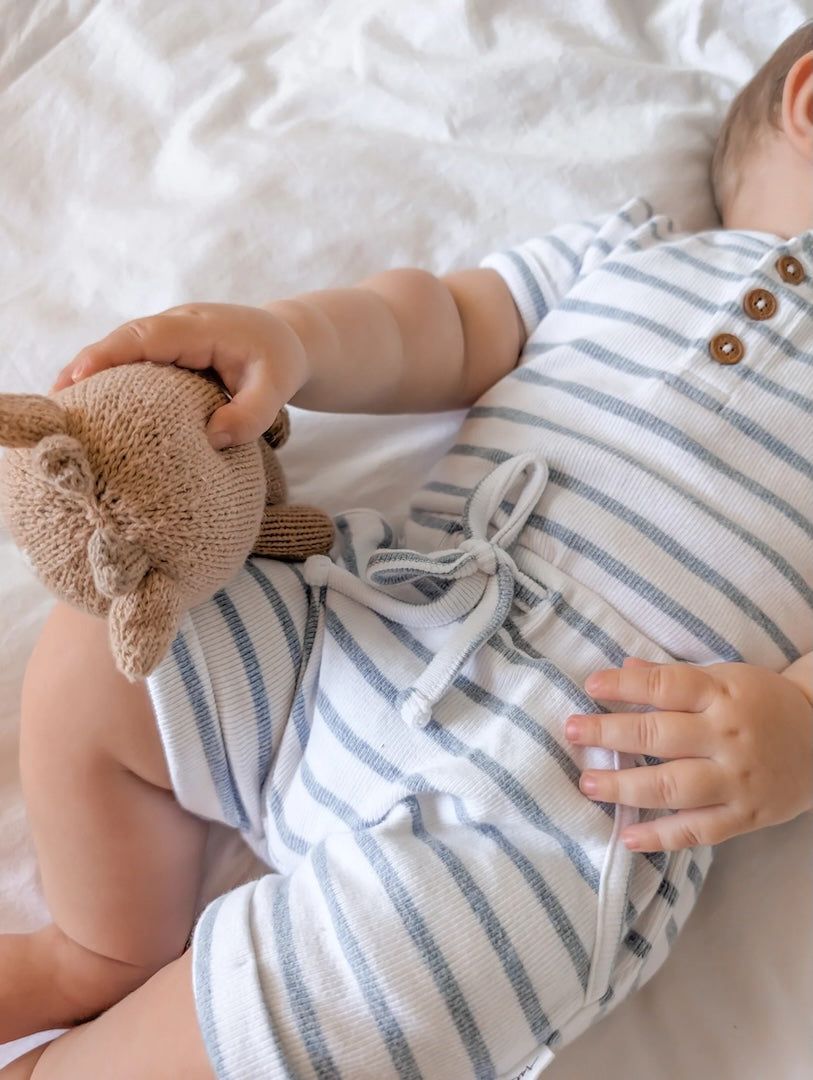 Keep little explorers cool and comfortable in these Blue Stripe Harem Shorts. Designed with plenty of room for wriggly legs and crafted from soft breathable organic cotton rib, these shorts are a timeless staple for any little guy's wardrobe.