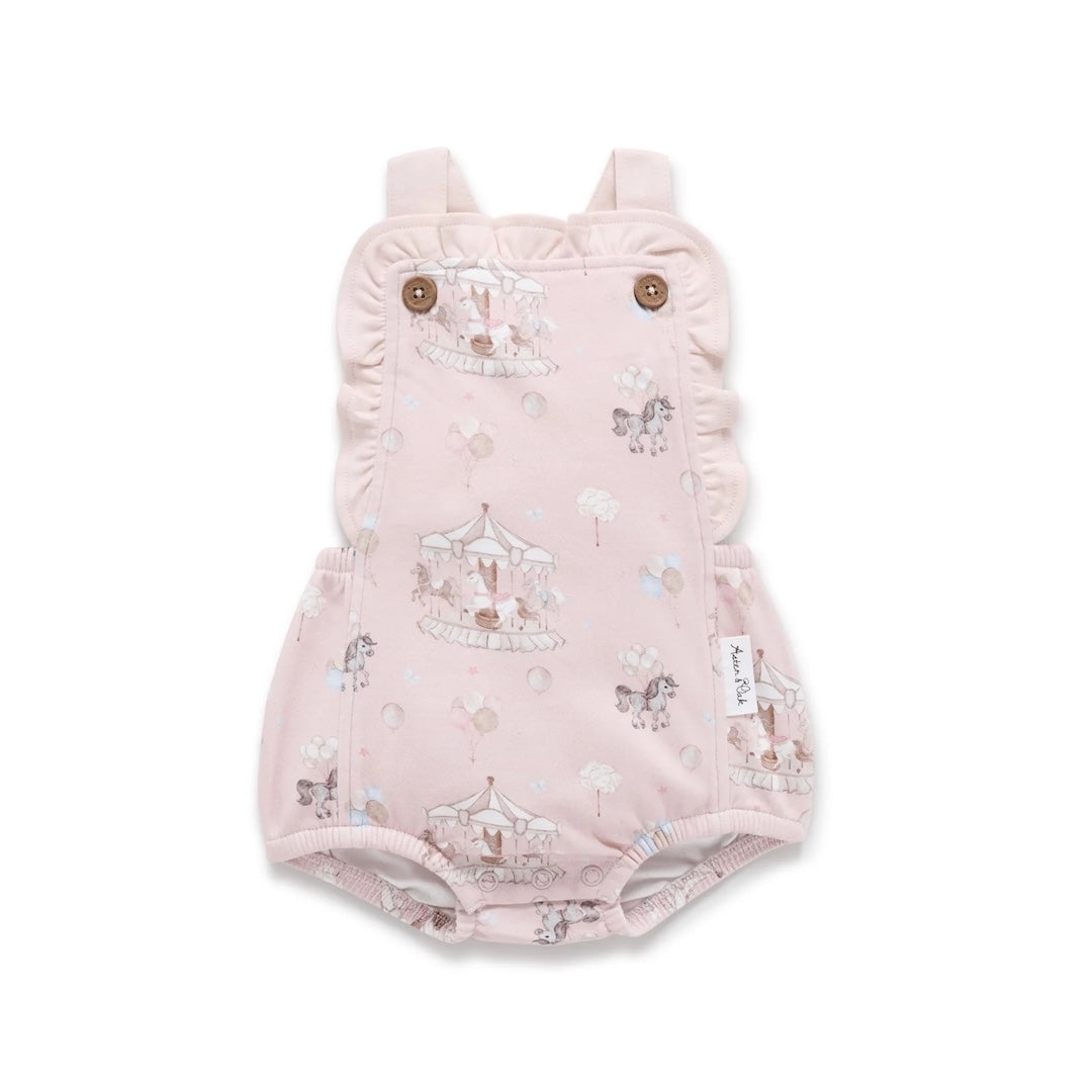 A celebration of soft tones and playful charm, this ruffle playsuit has an adorable all-over carousel pony print set against a gentle rose pink base. Designed with both style and function in mind, the playsuit is crafted from luxuriously soft certified organic cotton and features a frilled bodice with layered ruffles across the back creating a beautiful nostalgic silhouette, perfect for sunny days and special moments.