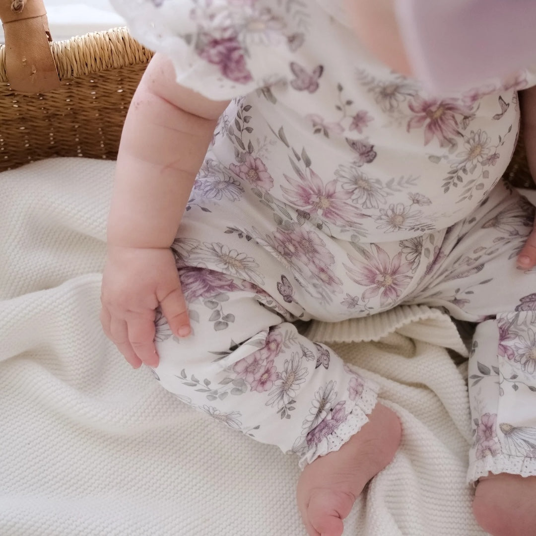 Gorgeous florals and sweet lace trim these leggings are must have for sunny outings and adventures. Crafted from soft certified organic cotton and with an elastic waist they will fit perfectly and provide all day comfort. Easily paired with an essential wardrobe piece like our White Ruffle Puff Top or onesie, you will have stunning and versatile choices all season long.