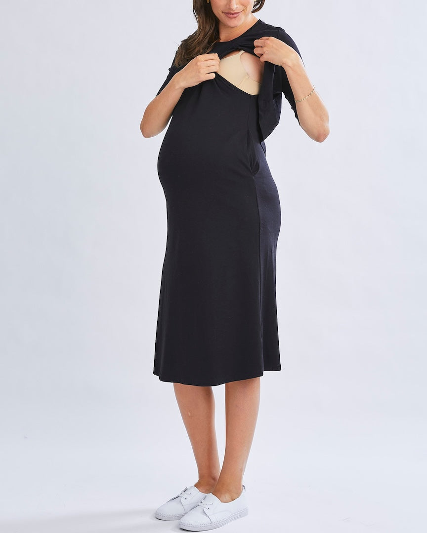 The versatile dress is great for work, play, travel, and is maternity nursing friendly. This super stretchy dress is designed to fit and flatter any body shape, especially with a growing belly.