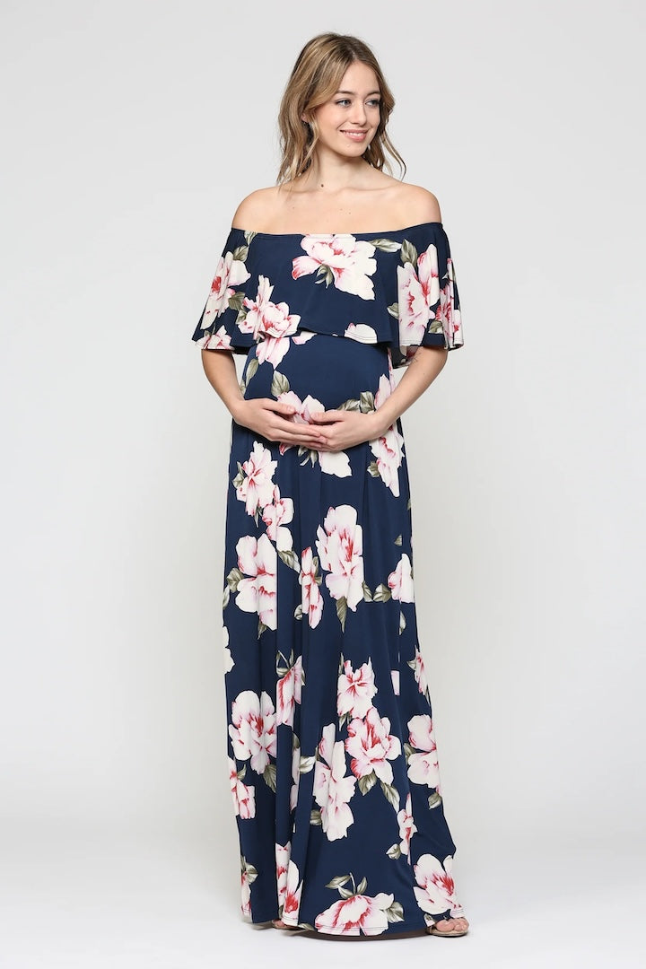 Off Shoulder maternity pregnancy maxi dress navy floral for special events, baby shower, weddings, post partum and into motherhood.