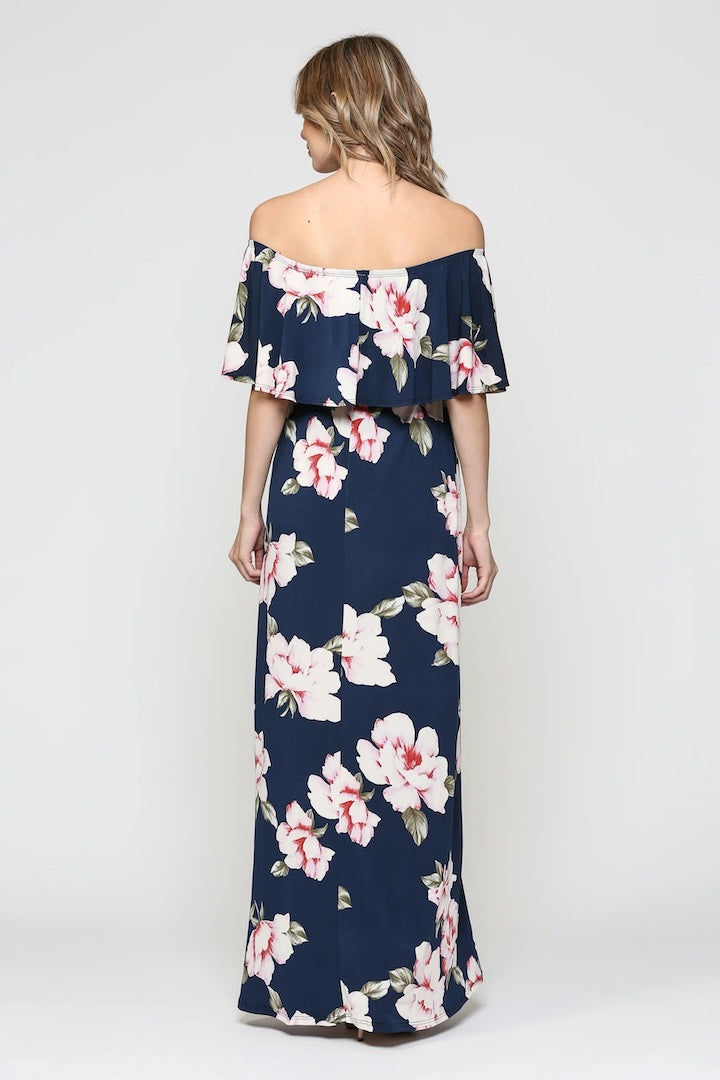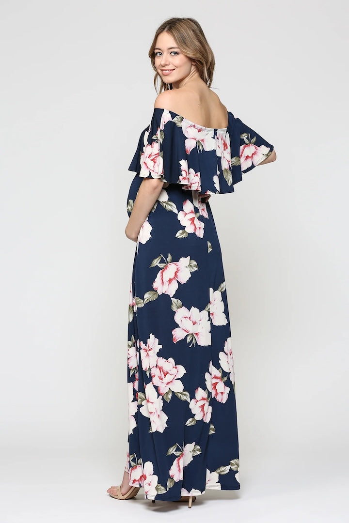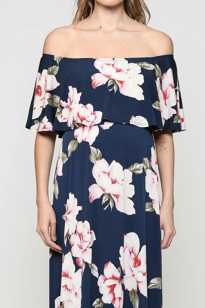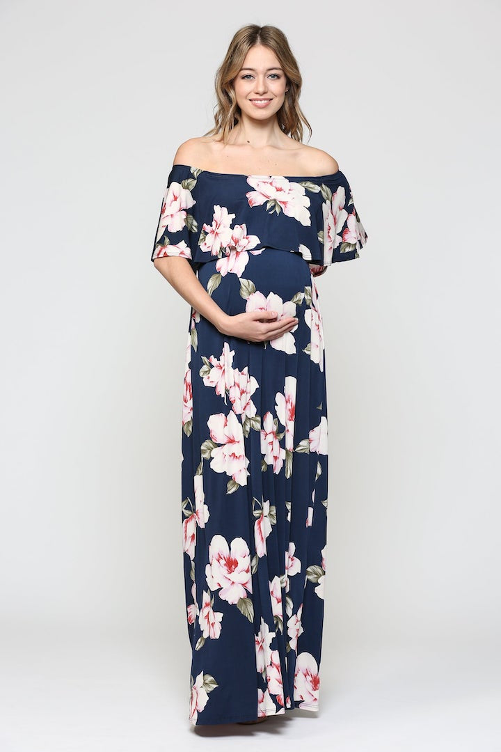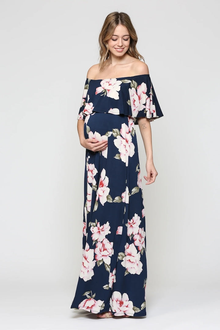 Navy Blush Florals Off Shoulder Ruffle Maxi Maternity Dress