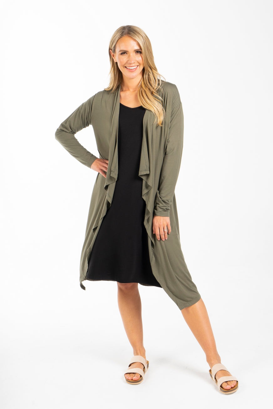 Layer easily through pregnancy, breastfeeding and motherhood with the Flyaway Cardigan! It is the perfect throw on staple for cooler months, with long, fitted sleeves and a knee length hem creating warmth and effortless class. The open, draping style is a stunning detail that layers beautifully over your PQ outfit. The soft and breathable fabric is made from sustainable bamboo fibres.