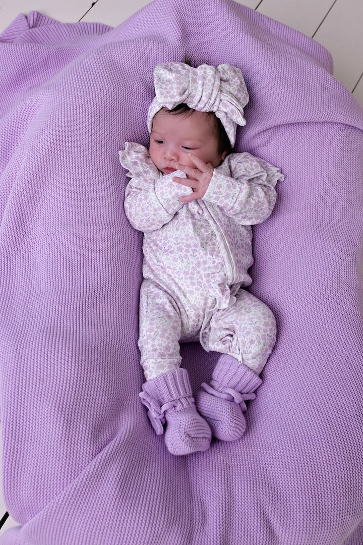 The stunning Lilac Frilly Knit Blanket—a must-have for every new arrival. Thoughtfully designed, and elegantly presented in luxe, gift-ready packaging to match its beauty.