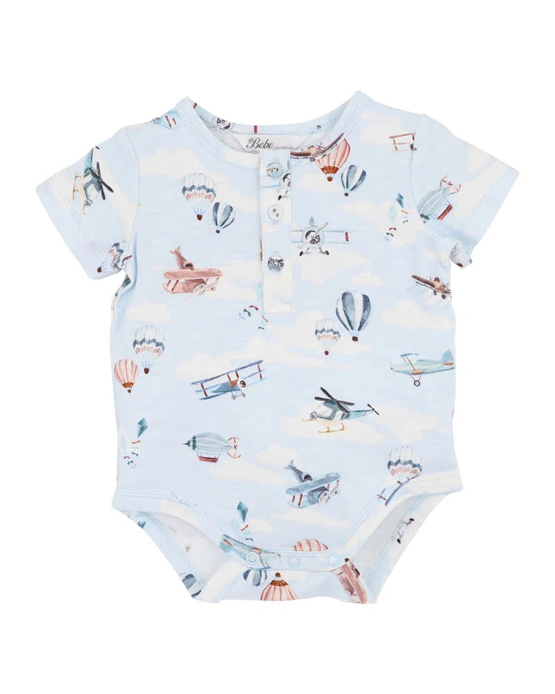 Up, up and away! This delightful bodysuit is ready for sky-high adventures with its whimsical print of vintage planes, balloons and blimps drifting through the clouds. Made from a soft cotton elastane jersey, it offers gentle stretch for all-day comfort and play. A front button placket and crotch press studs make dressing and changes a breeze. Match it back with the Boys knit denim shorts or the Boys rust shorts for a cute little outfit.