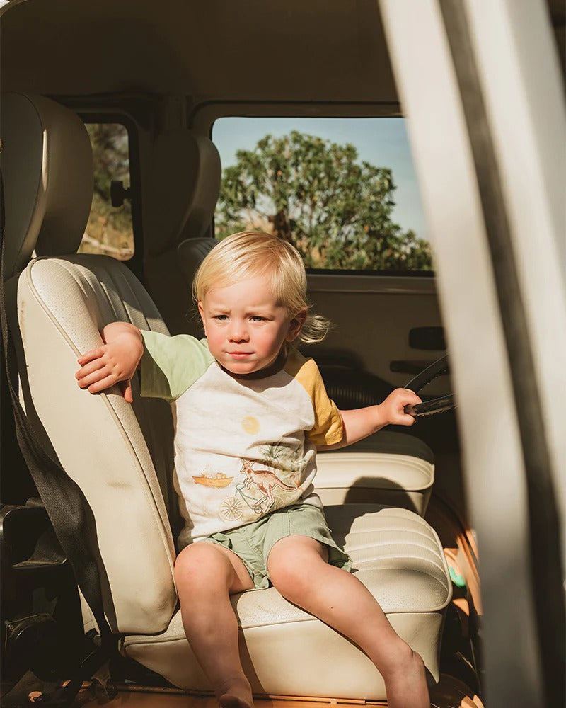 Let little adventurers ride into the wild with this playful tee featuring a cheeky kangaroo off on a two-wheeled adventure! Bursting with Aussie charm, this everyday favourite is designed in earthy tones with soft raglan sleeves and a tactile 3D kangaroo appliqué that little hands will love. Made for endless summer exploring, it's perfect worn with many different shorts to match