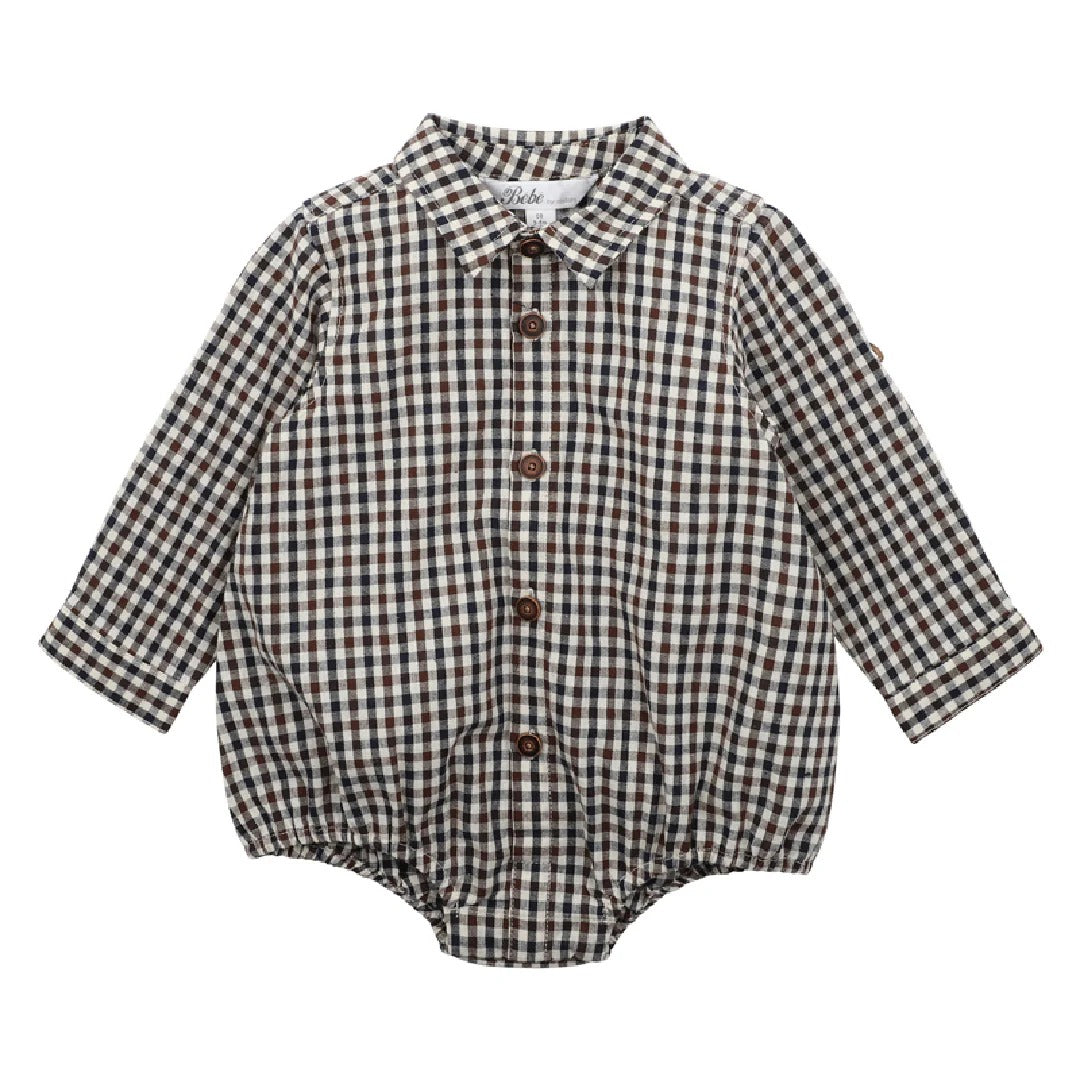 Keep your little one looking stylish, neat and tucked in with this brown gingham shirt bodysuit. Featuring a button up collar and adjustable long sleeves with buttoned sleeve tabs giving the option to make the shirt short sleeved is perfect for dressing your little man up.