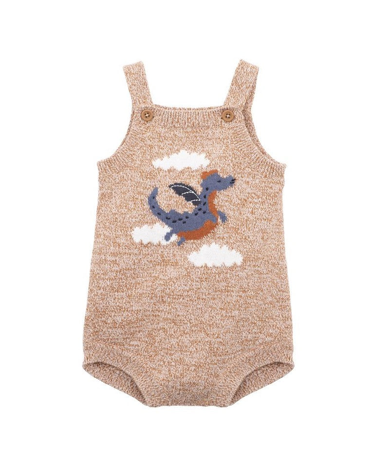 This gorgeous organic mottled yarn knitted bodysuit features a cute dragon graphic on the front, adjustable button straps and a concealed press stud crotch opening for ease of dressing your little one.