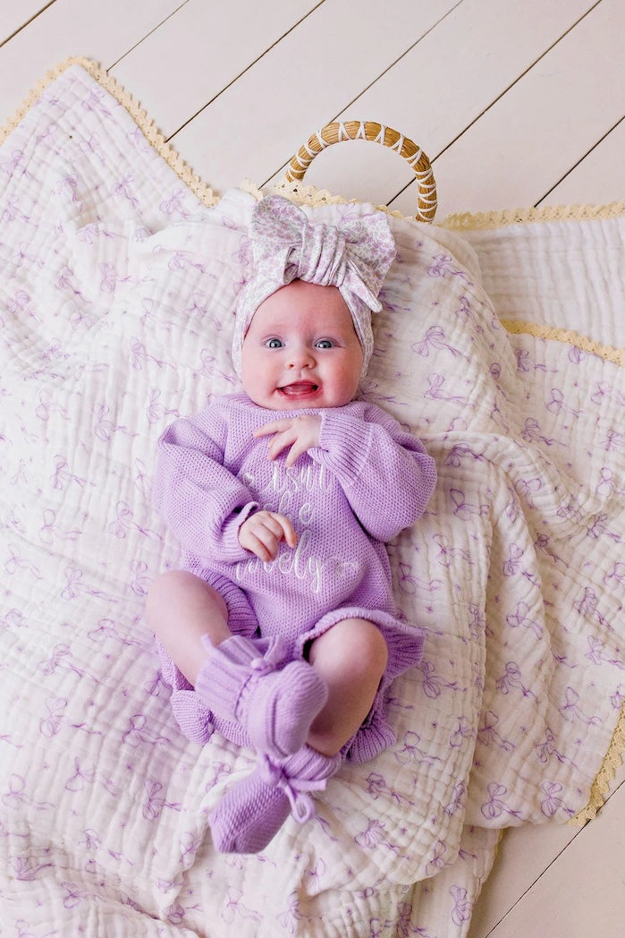 Confetti Kidz' beautiful oversized pre-tied bow in a garden florals is the perfect finishing touch to pair with their heirloom-quality announcement rompers, and lilac zippies. These come beautifully presented in gift-ready packaging.