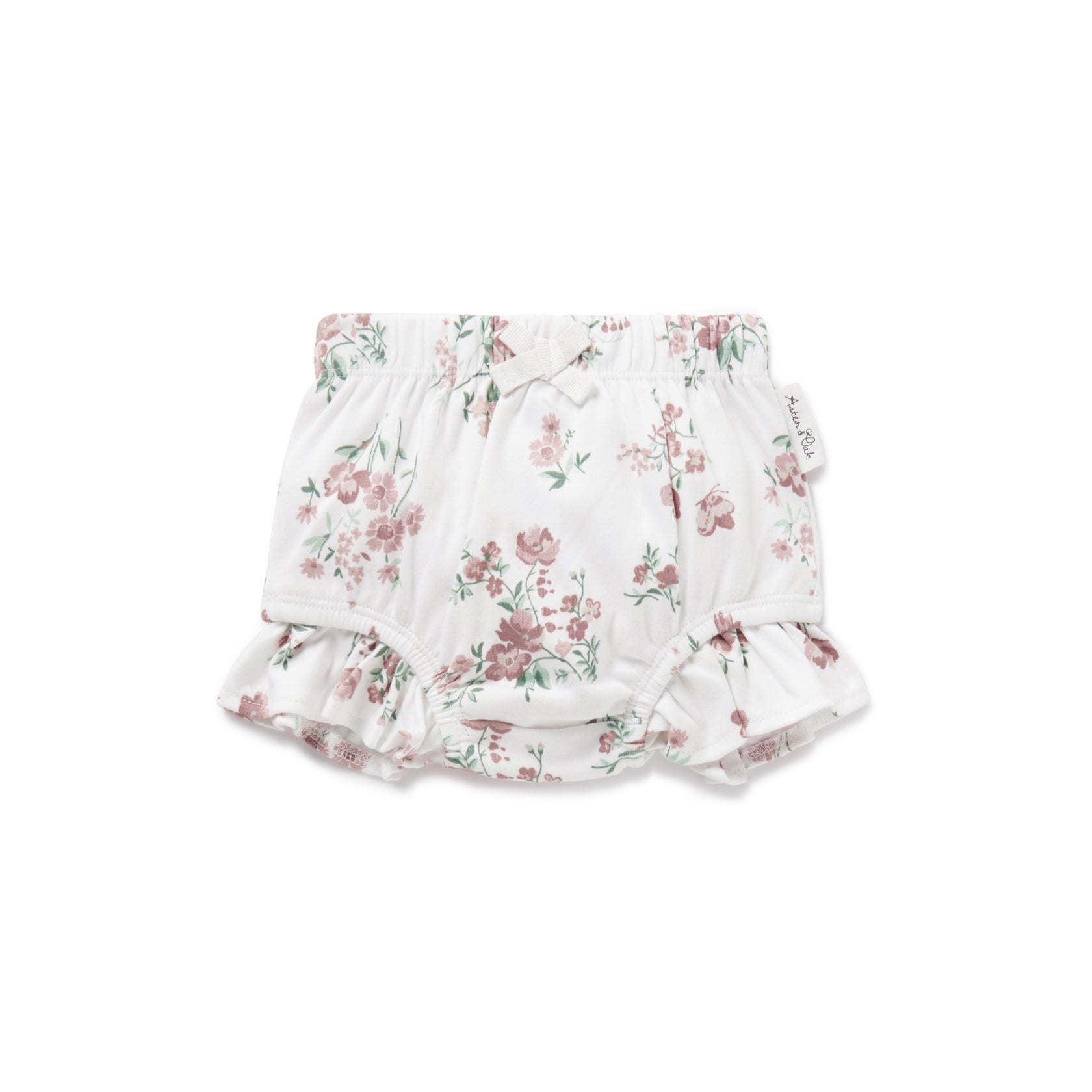 Crafted from the softest organic cotton, the Primrose Ruffle Bloomers are the perfect nappy cover for any occasion. Featuring a delicate all-over vintage floral print, drawstring waist, oversized design to accommodate various styles of nappies and sweet flutters on the legs. Perfect to wear on their own or paired back with other Aster & Oak styles.